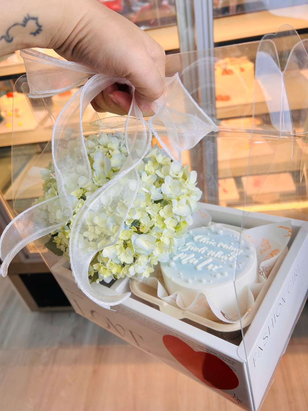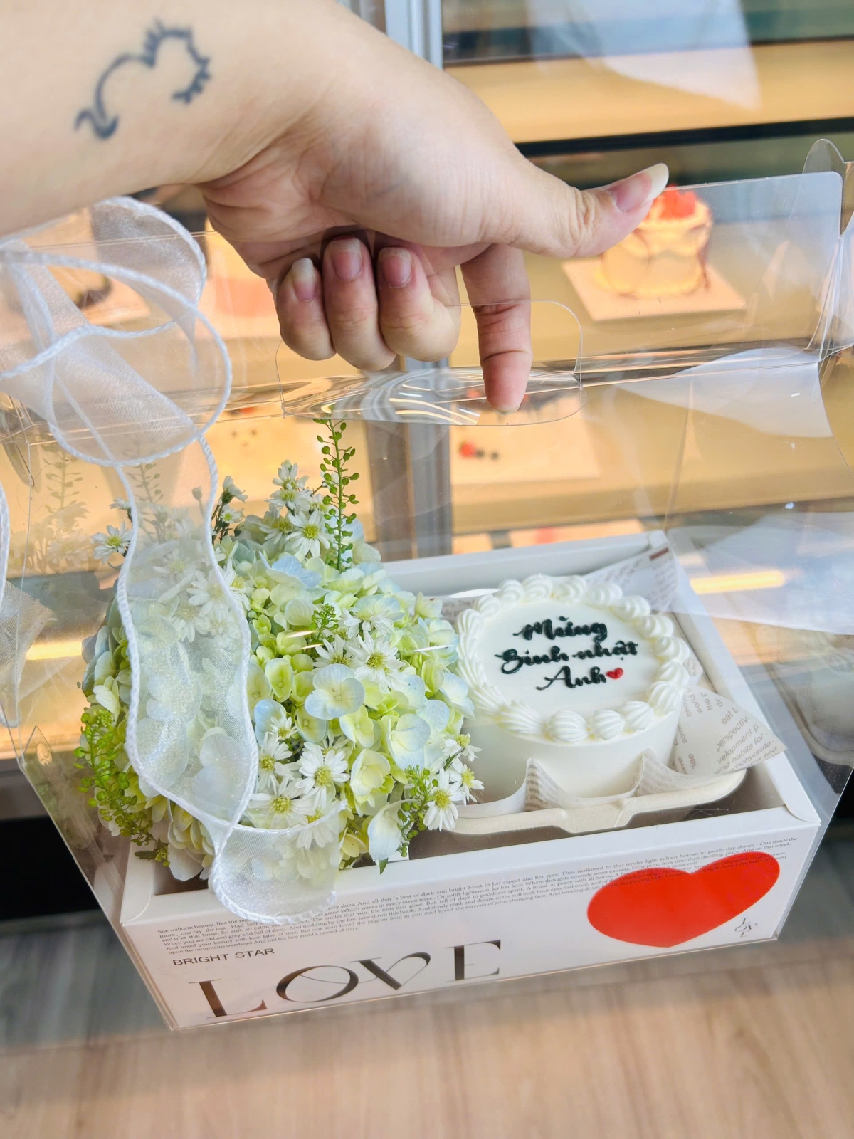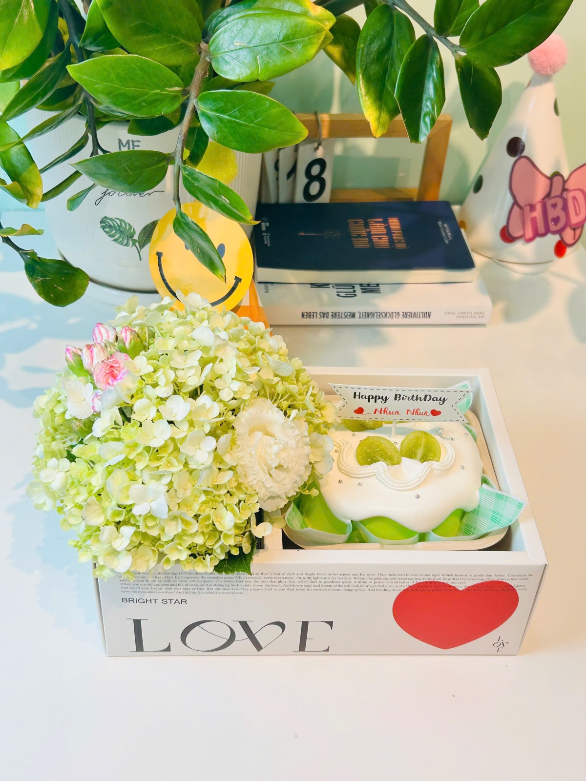 Sét bánh kem tươi và hoa cẩm tú cầu